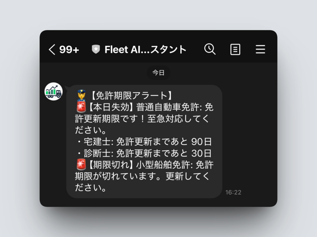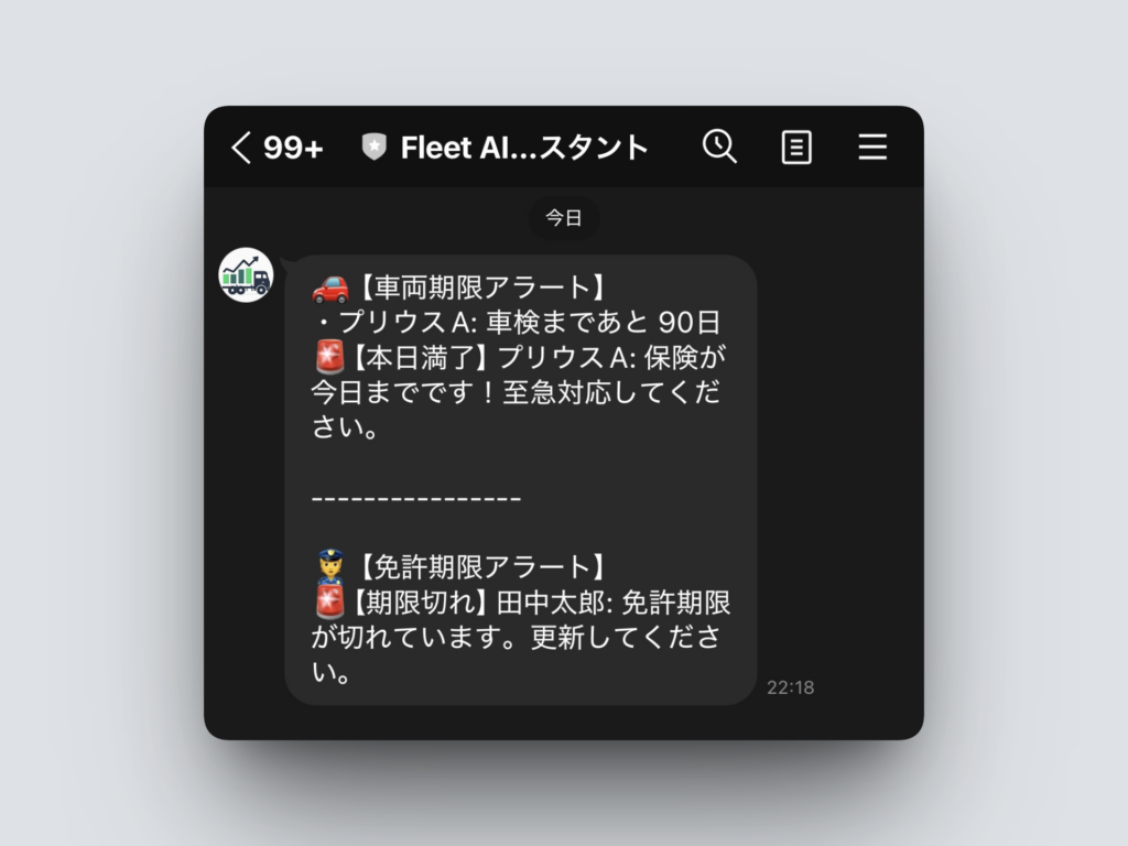 Fleet Cost Managerは、90日前・30日前・7日前のタイミングでLINEに警告をプッシュ通知。